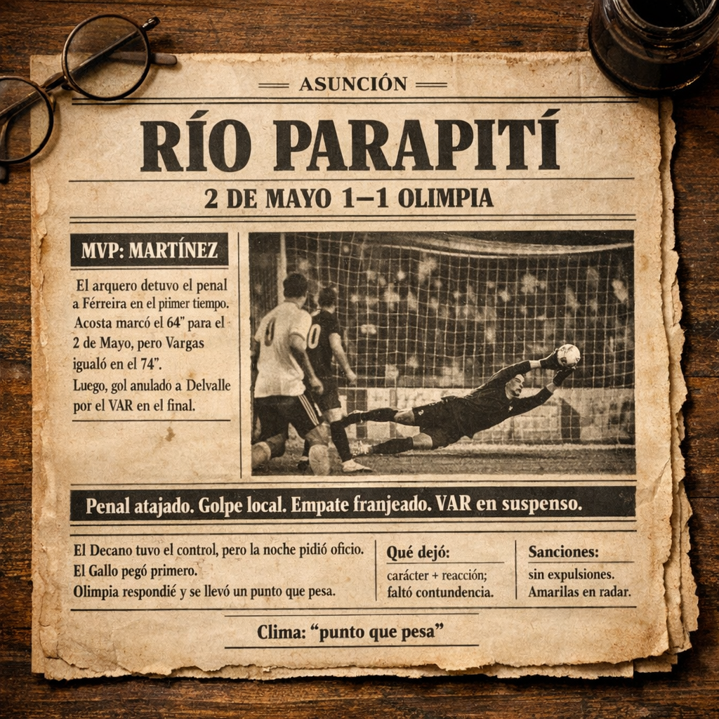 Después vino el golpe local: Diego Acosta puso el 1–0 a los 64’, y Olimpia tuvo que elegir entre desesperarse o responder con oficio. Eligió lo segundo: a los 74’, Gustavo Vargas clavó el 1–1 y el cierre fue una mezcla de tensión y alivio, con un gol de 2 de Mayo que se gritó… y luego el VAR anuló, dejando el punto en manos franjeadas como un recordatorio: incluso cuando no sale perfecto, Olimpia no se quiebra—se reorganiza y sigue